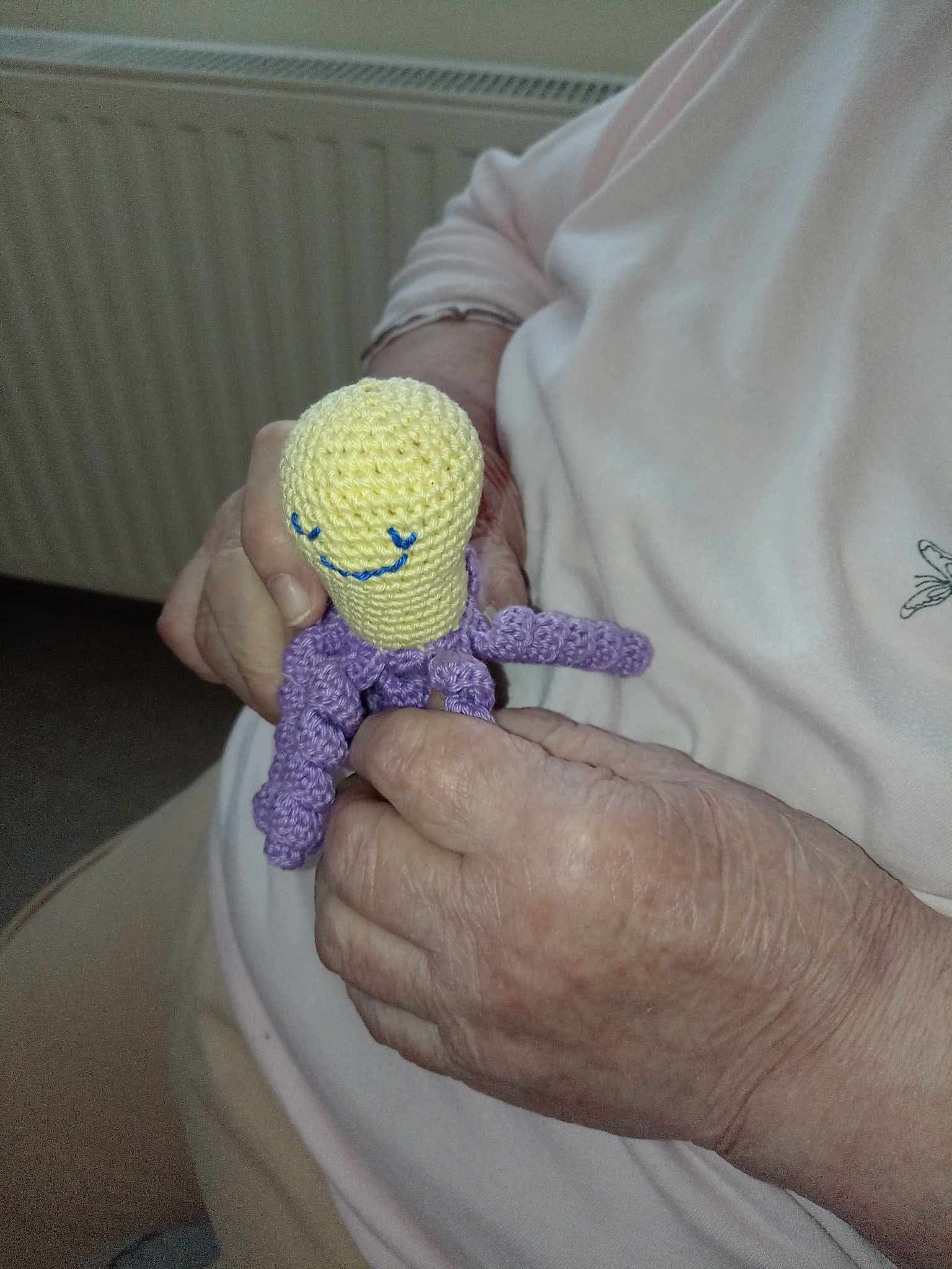 Mint már tudjátok, a koripok elkészítése szigorú előírásokhoz kötött, és önkénteseink, felajánlóink, köztük a gyakorlott horgolók is, számos csápost készítenek, mire megszületik az első tökéletes korip. A jól sikerült, de nem teljesen szabályos polipfiguráknak igyekszünk mindig célt találni, sokszor óvodák, fejlesztéssel foglalkozó szakemberek vagy idősotthonok lakói kapják meg ezeket a kedves figurákat. A lenti fotók is egy idősotthonból érkeztek. Fantasztikus látni, hogy a sok idő, munka és szeretet, amit az alkotók a koripokba fektetnek, még ha nem is az eredeti úton, de sok embernek szerez örömet és boldog pillanatokat.